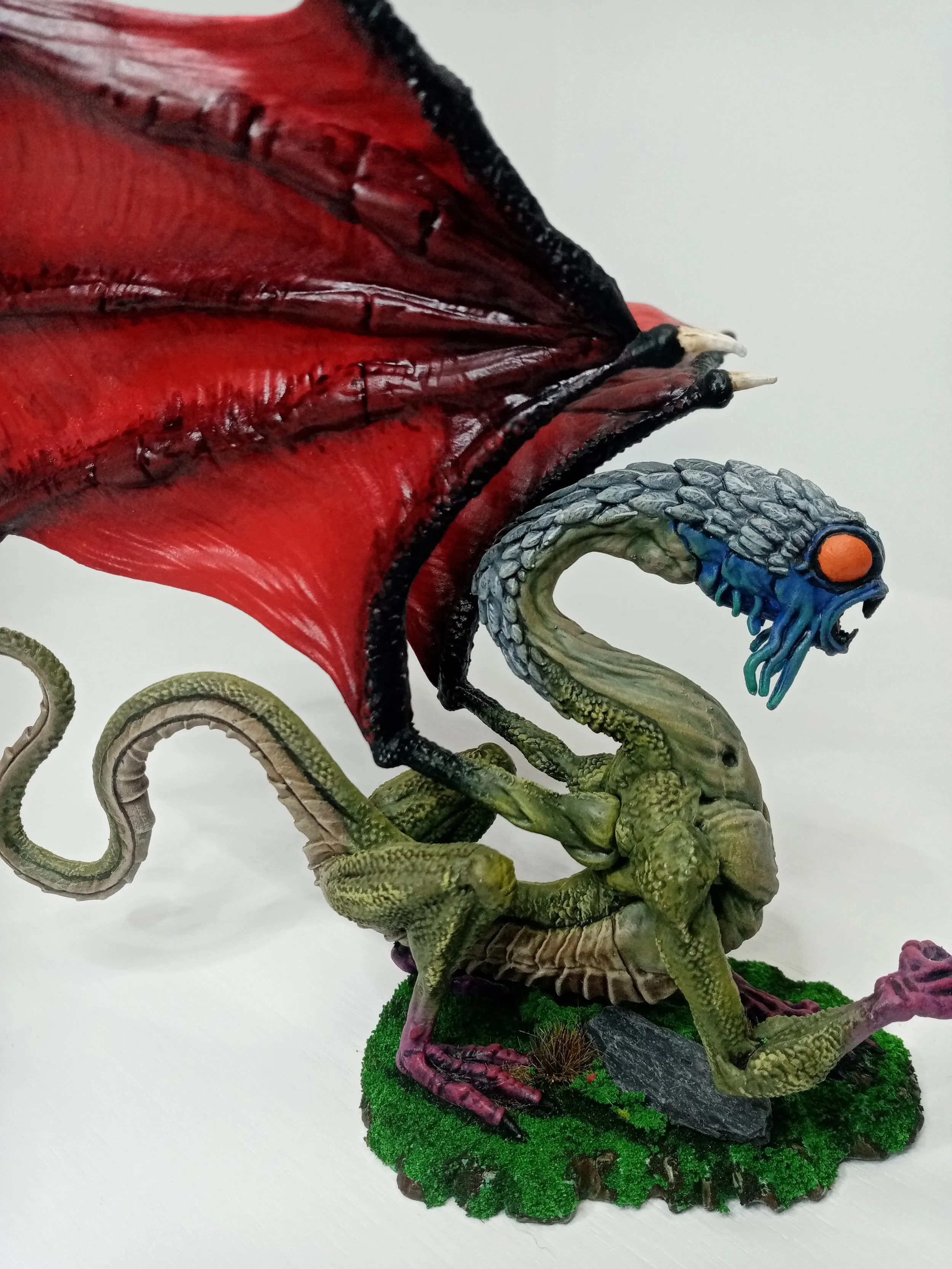 Sorry no progress photos as such. I chose this miniature to paint because its got lots of different textures on it. Some points it has scaled skin like a reptile, feathers around the head and neck area but a very aquatic looking face. Oh and also a pair of fantastic dragon wings! Very much a learning piece. It was a joy to paint and I feel I learnt so much doing it. I certainly haven’t seen a Jabberwock portrayed quite like this as they always seem to be just one colour (usually green).