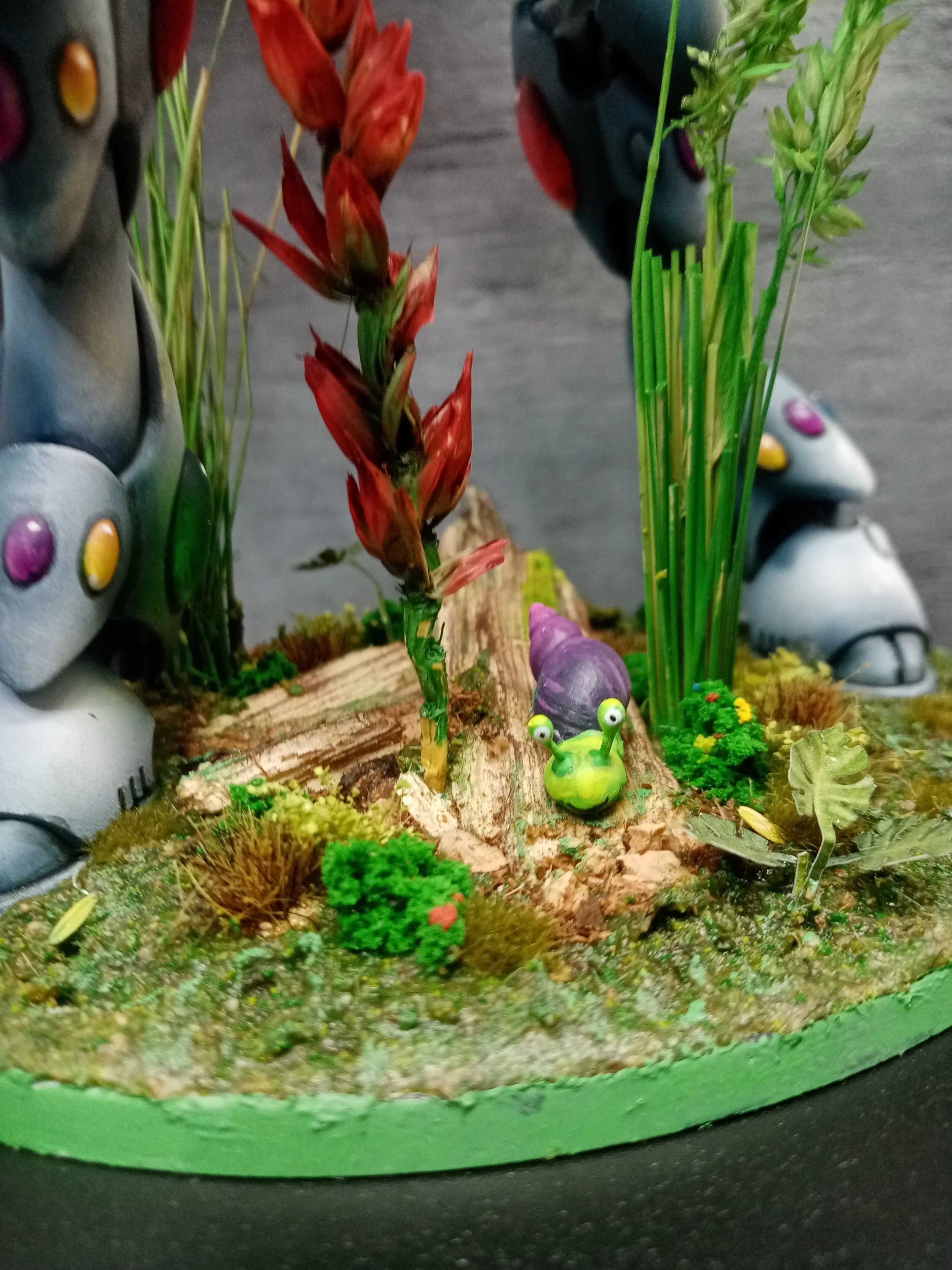 This was a marathon piece for me. It took a lot of time, effort, rework and patience that I had to leave it alone occasionally and go back later. I honestly can not remember how many times I returned to this to change this and that, add things, delete things and completely repaint parts I wasn’t happy with. It was very intentionally far removed from the box art. The base was really another project in itself. I used a lot of parts that I found in my garden or on walks including the snail shell (which was empty when I found it!).